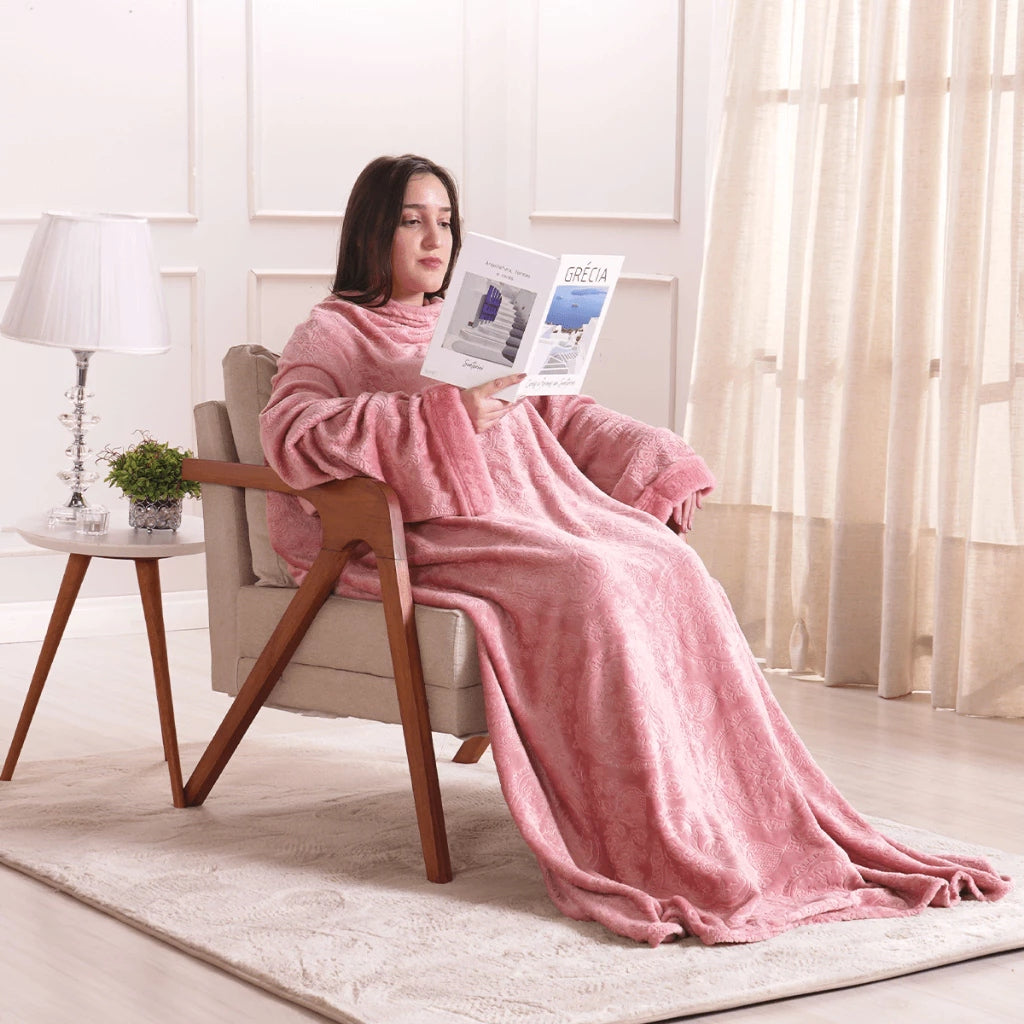 Diferente dos cobertores tradicionais, este modelo com mangas proporciona liberdade de movimento sem perder o calor.